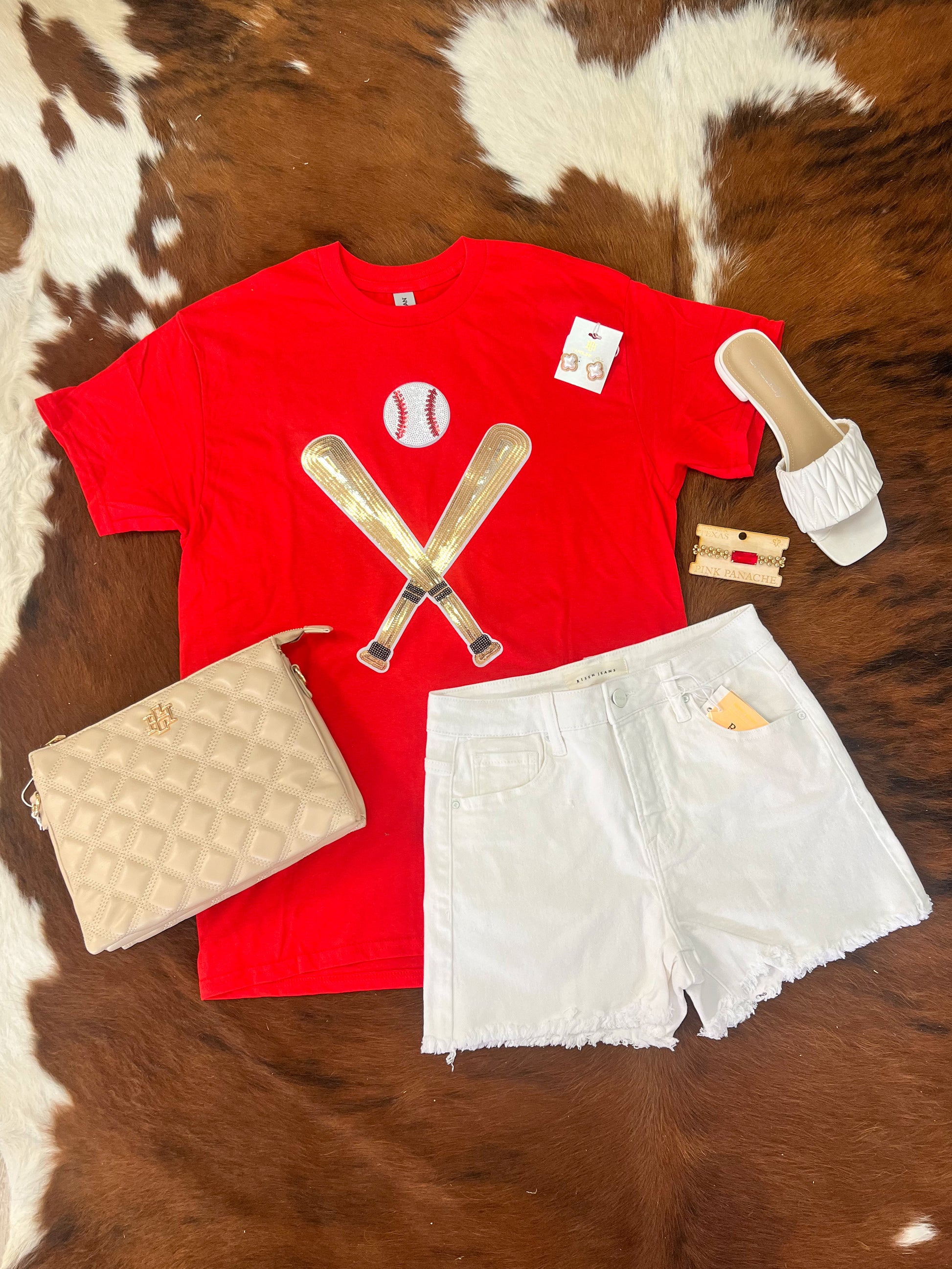 This sequin patch t-shirt's design features a baseball and two crossed baseball bats. This top is perfect for baseball season!