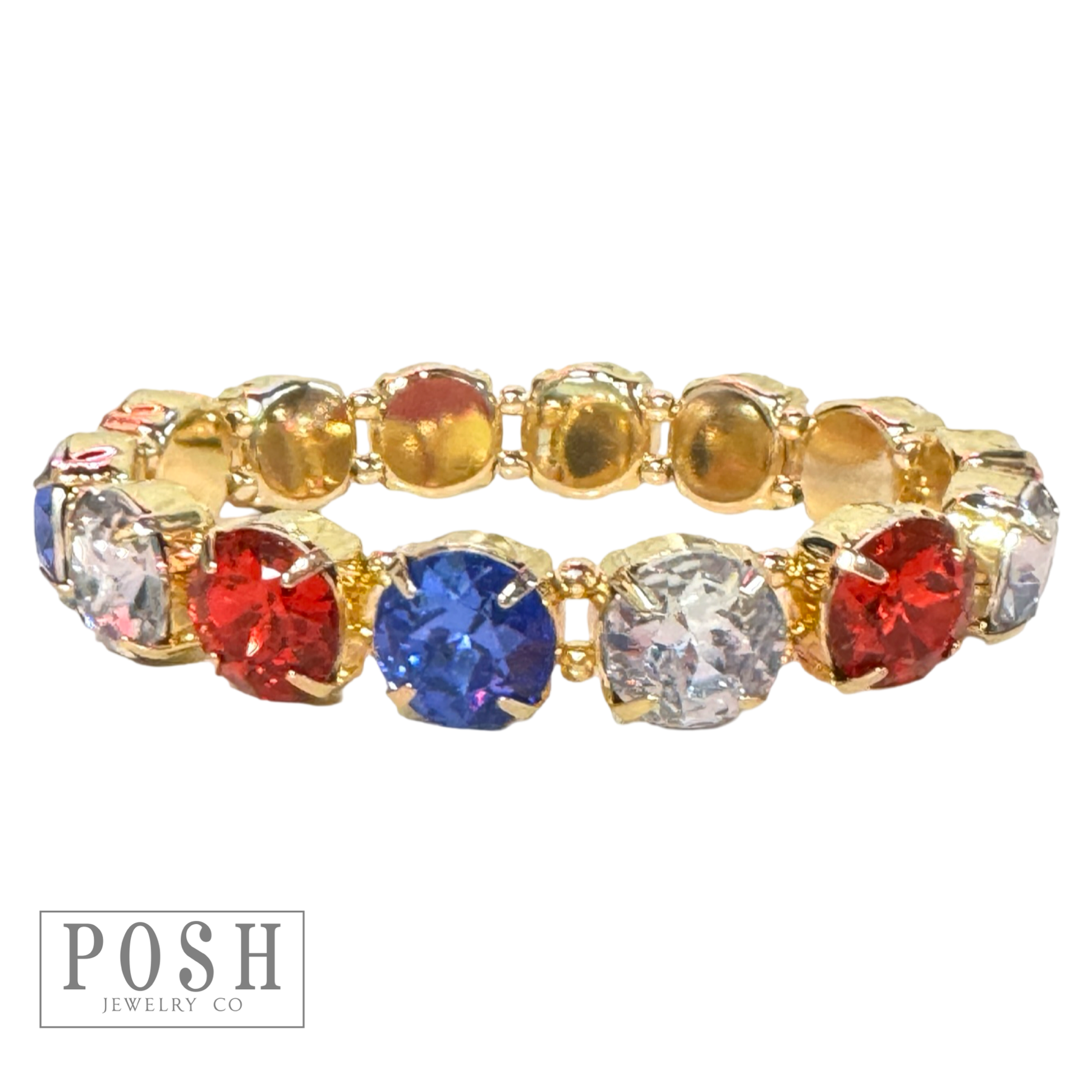 This bracelet has sparkling red, clear and blue round shaped rhinestones prong set in a gold tone bracelet with little bead spacers. The bracelet stretches for easy on and off. One size fits most.