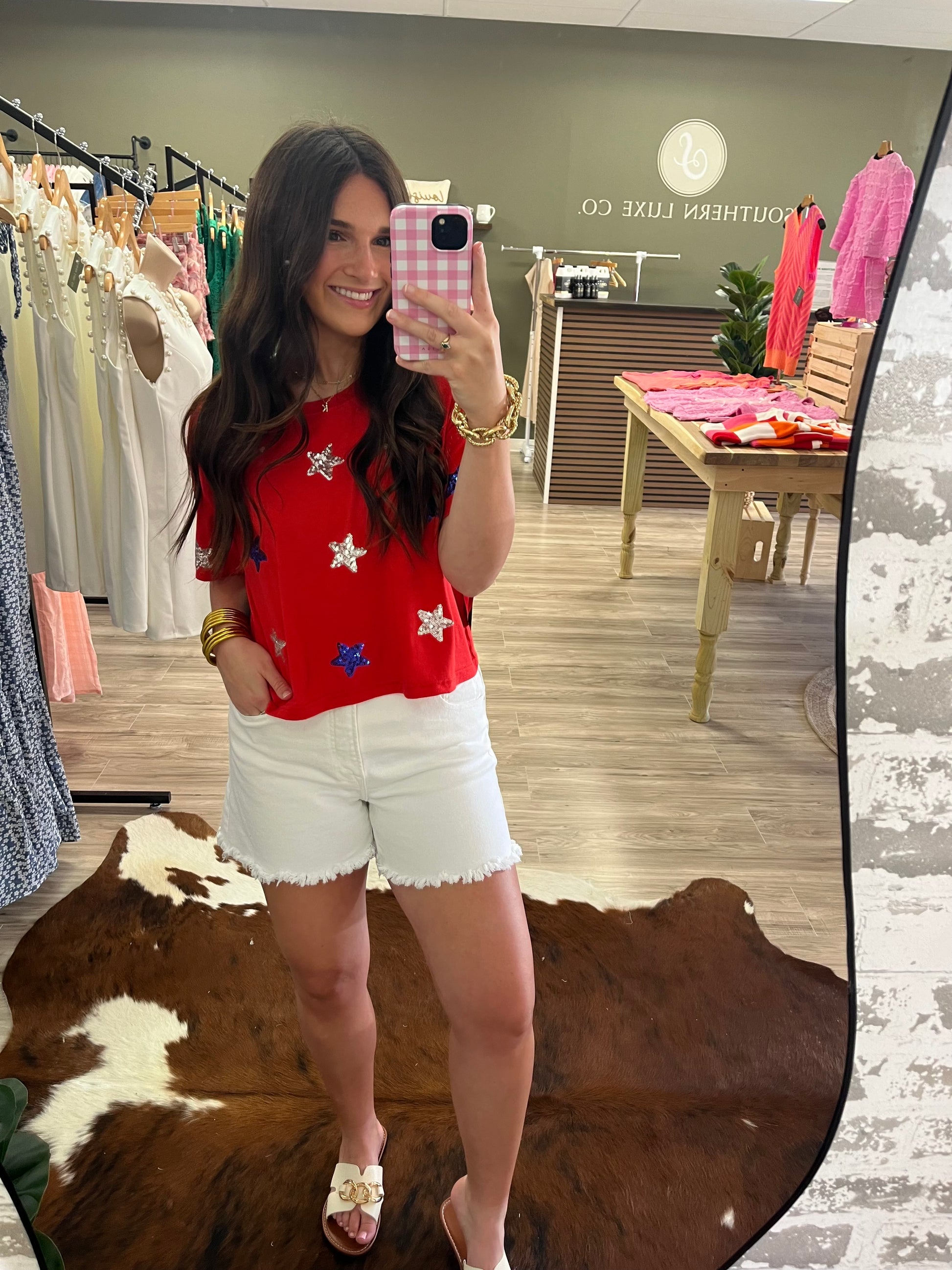 You were once a twinkle in someone’s eye, and now you’re a full blown star. If the flag is allowed to flaunt our freedom in all its glory, why shouldn’t you?! Take a page out of the book of patriotism and stand our in this sparkly, red white and blue cropped tee at your next 4th of July celebration.